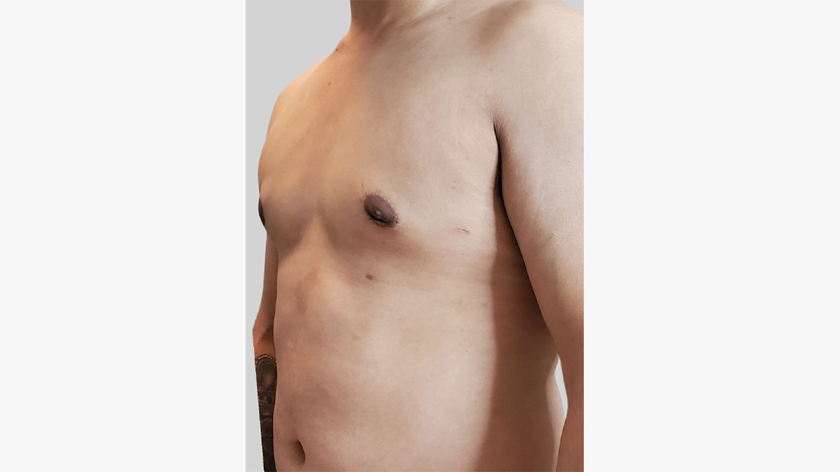 This patient opted for gynecomastia surgery with excision and contouring liposuction to achieve a flatter chest. Results are shown at three months post-op.
