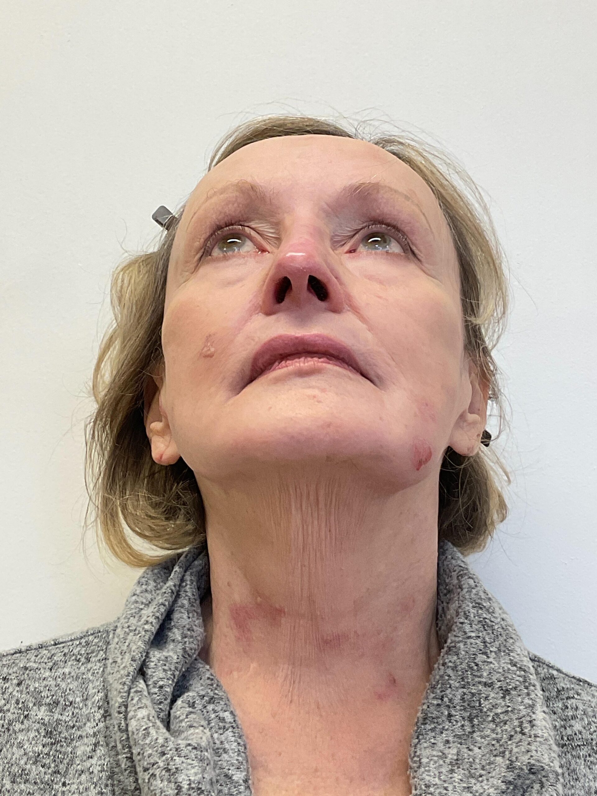 This patient achieved a more defined chin and jawline after submental liposuction with Dr. Somogyi. Results are shown at one month post-op.