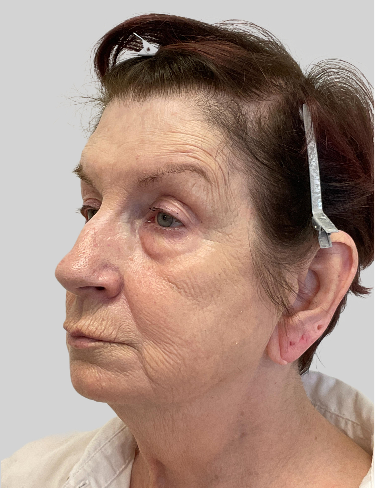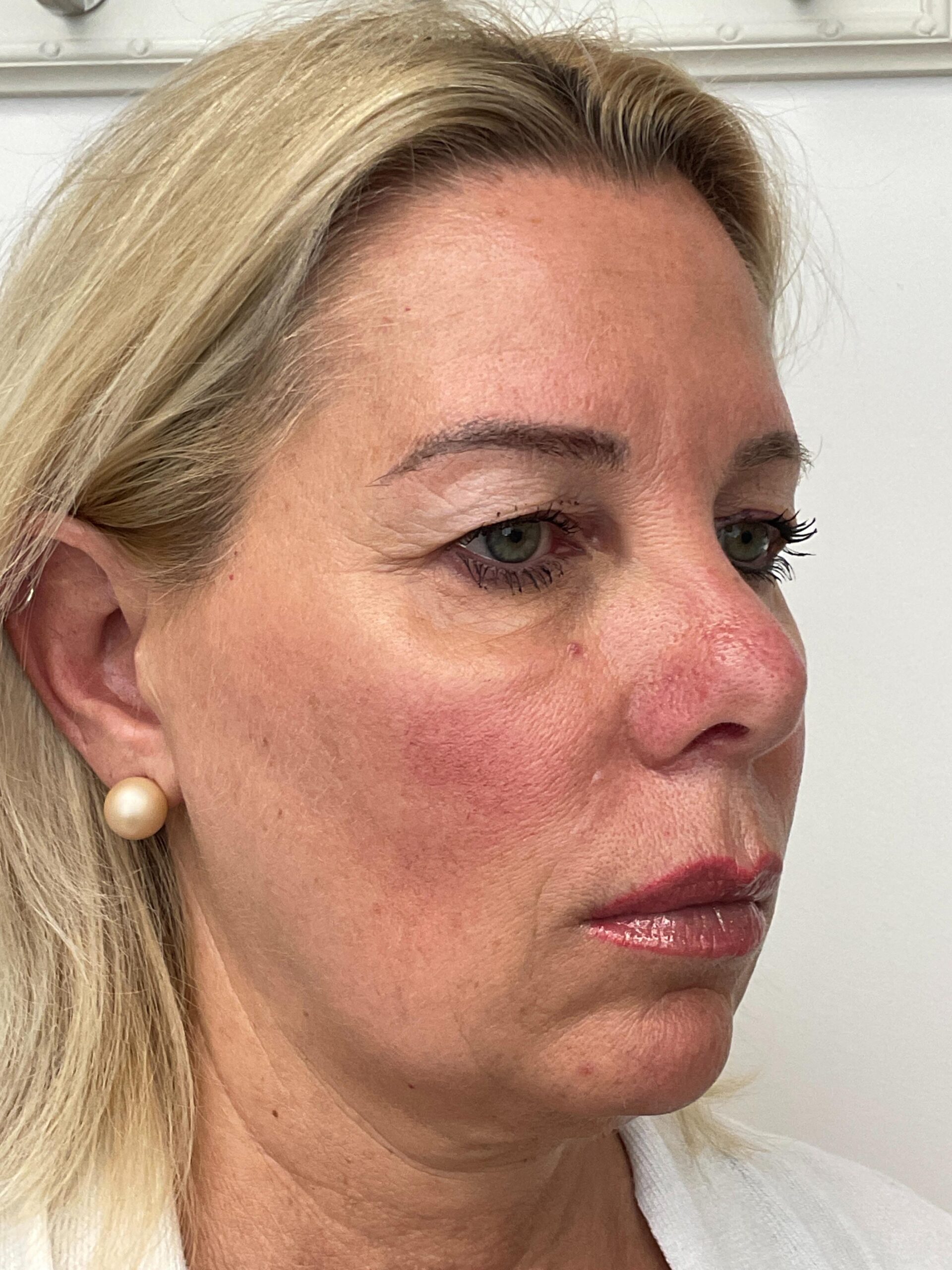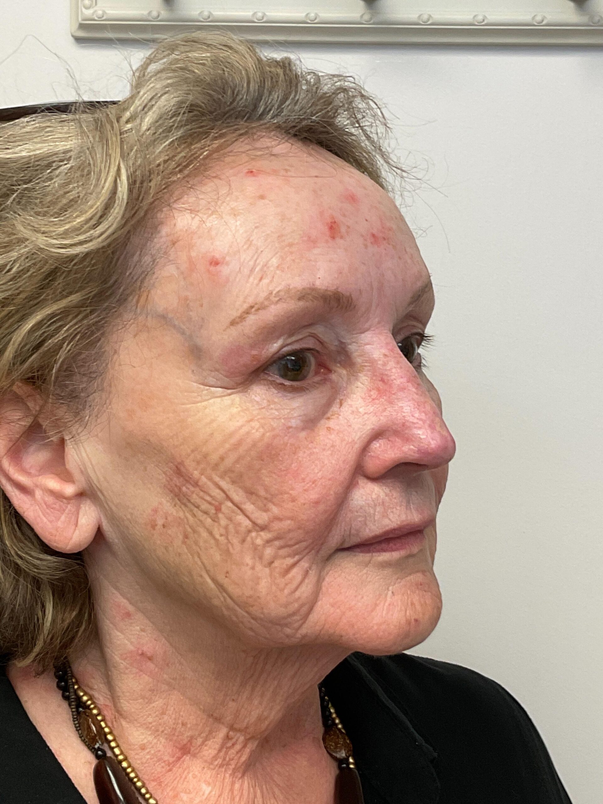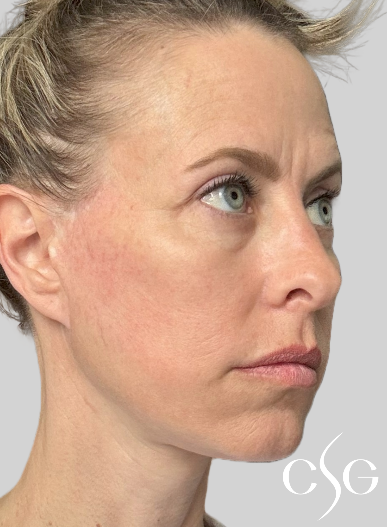 This patient came to see us with concerns about a tired and aged appearance. We wanted to achieve a total facial rejuvenation while addressing sagging jowls, soft tissue descent, and moderate crow’s feet. Her treatment plan included: